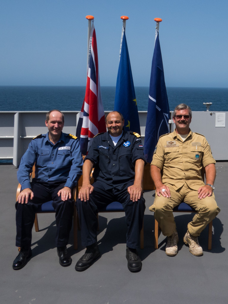 Force Commander Combined Maritime Forces, Commodore Jeremy Blunden (leftt) the Force Commander from EU Naval Force, Commodore Peter Lenselink (centre) and Force Commander from NATO, Commodore Henning Amundsen ( right) on board of the EU Naval Force Flagship, HNLMS Johan de Witt. October 7, 2013 © EU NAVFOR