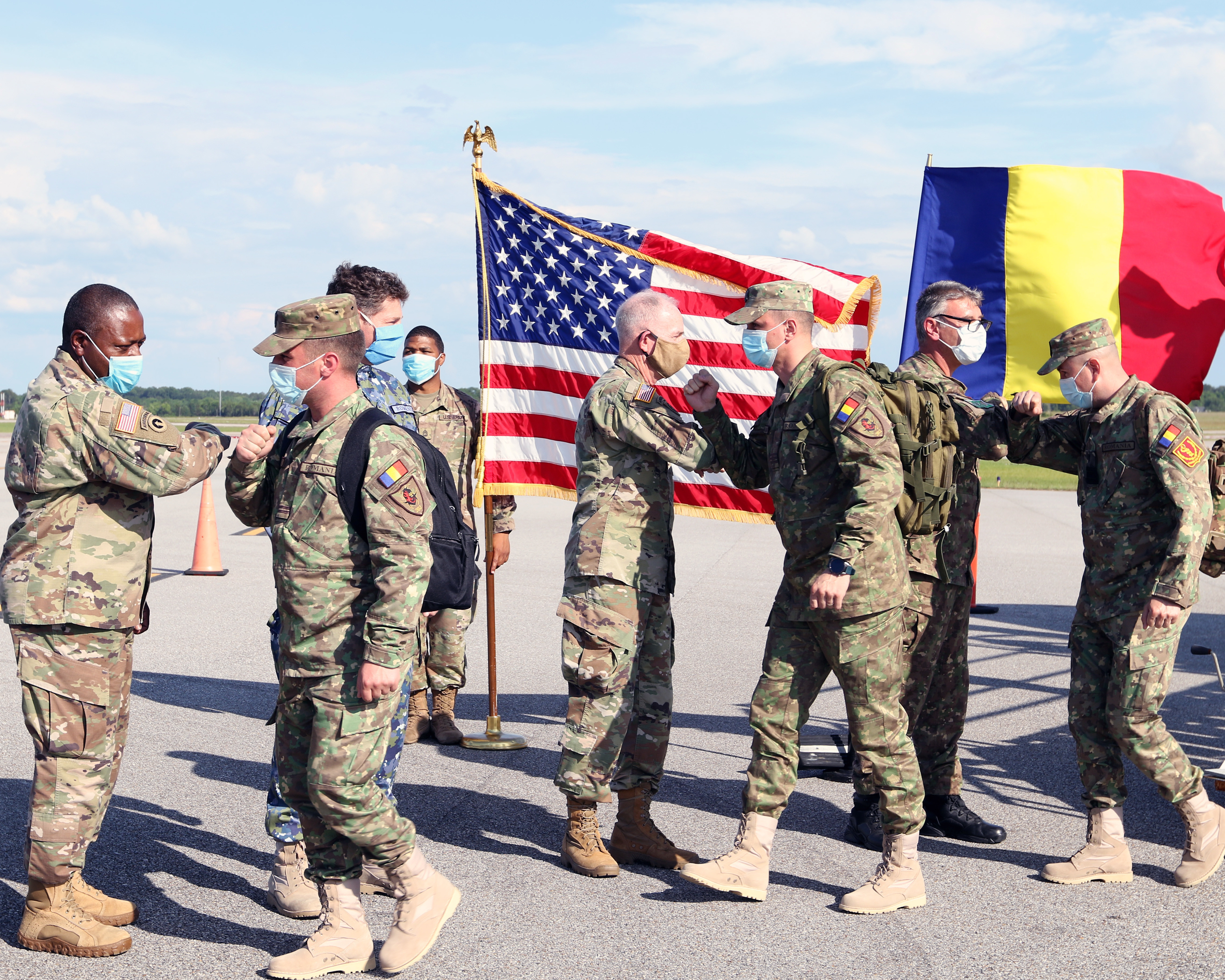 Members of the Alabama National Guard welcome a team of specialists from the Romanian Ministry of National Defense at Montgomery Aviation. May 25, 2020