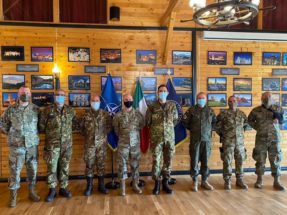 KFOR Chaplains were hosted for lunch by the KFOR Command Team, Major General Franco Federici and Command Sergeant Major Andrea Torre. Left to Right: Chaplain Cory Van Sloten (USA), Command Sergeant Major Andrea Torre (Italy), Chaplain Stephano Tollu (Italy), Chaplain Steve De Haan (USA), Major General Franco Federici (Italy), Chaplain Lukasz Siedlecki (Poland), Chaplain László Nanai (Hungary), Chaplain Joshua Twiest (USA). January 21, 2021©U.S Army KFOR RC East