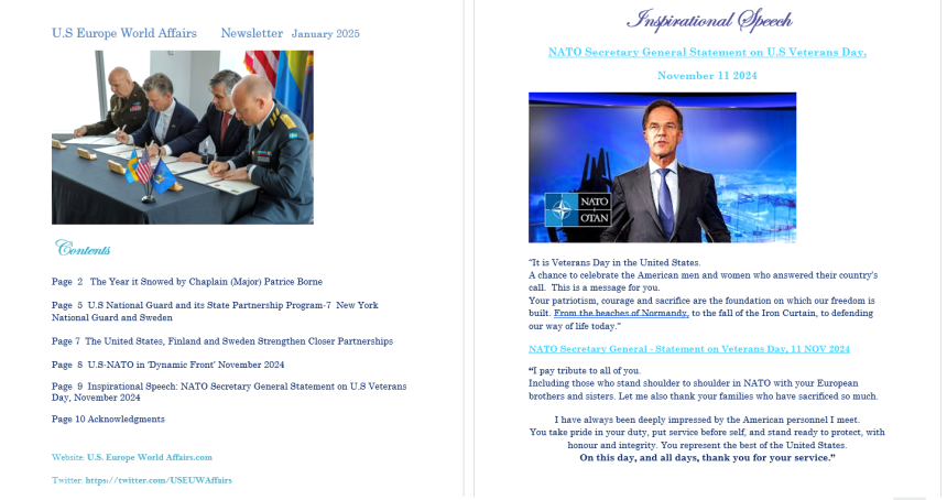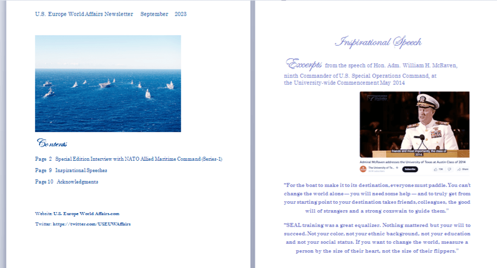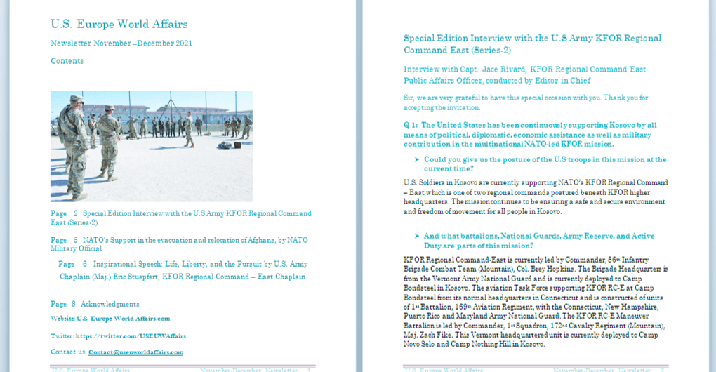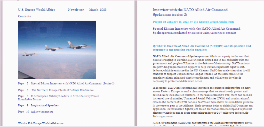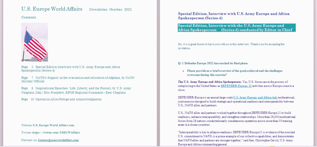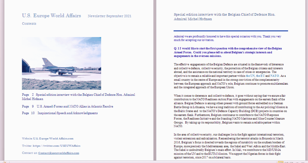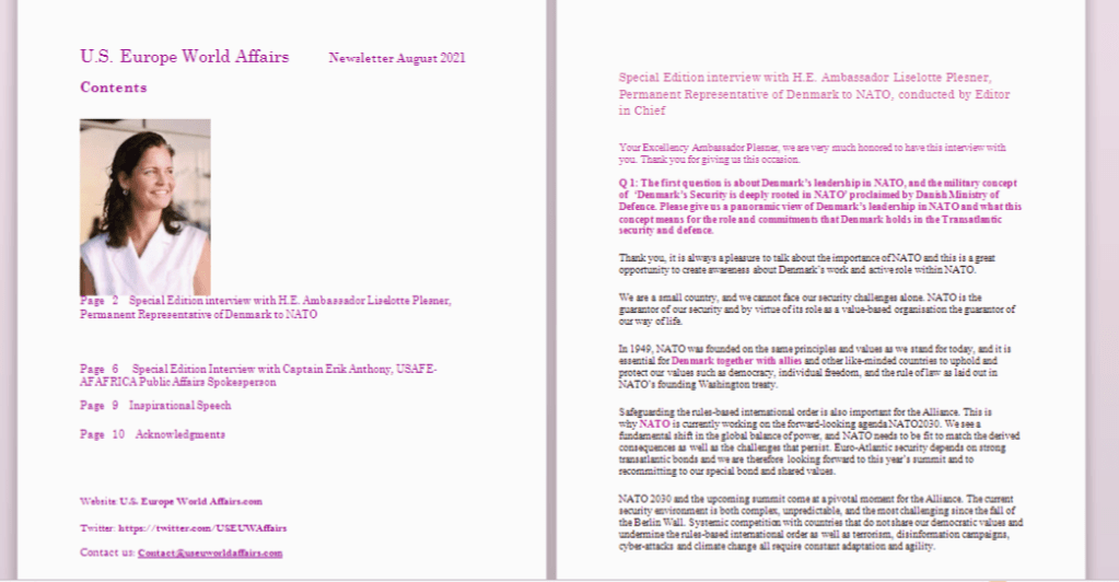 Dear all, due to the increased number of articles, news, and interviews on our media platform for the rest of 2021 our Newsletters will be published monthly. The interviews with Ambassador Liselotte Plesner, Permanent Representative of Denmark to NATO and Captain Erik Anthony, USAFE-AFAFRICA Public Affairs Spokesperson will be featured in August edition. Thank you for your interest. Editor in Chief