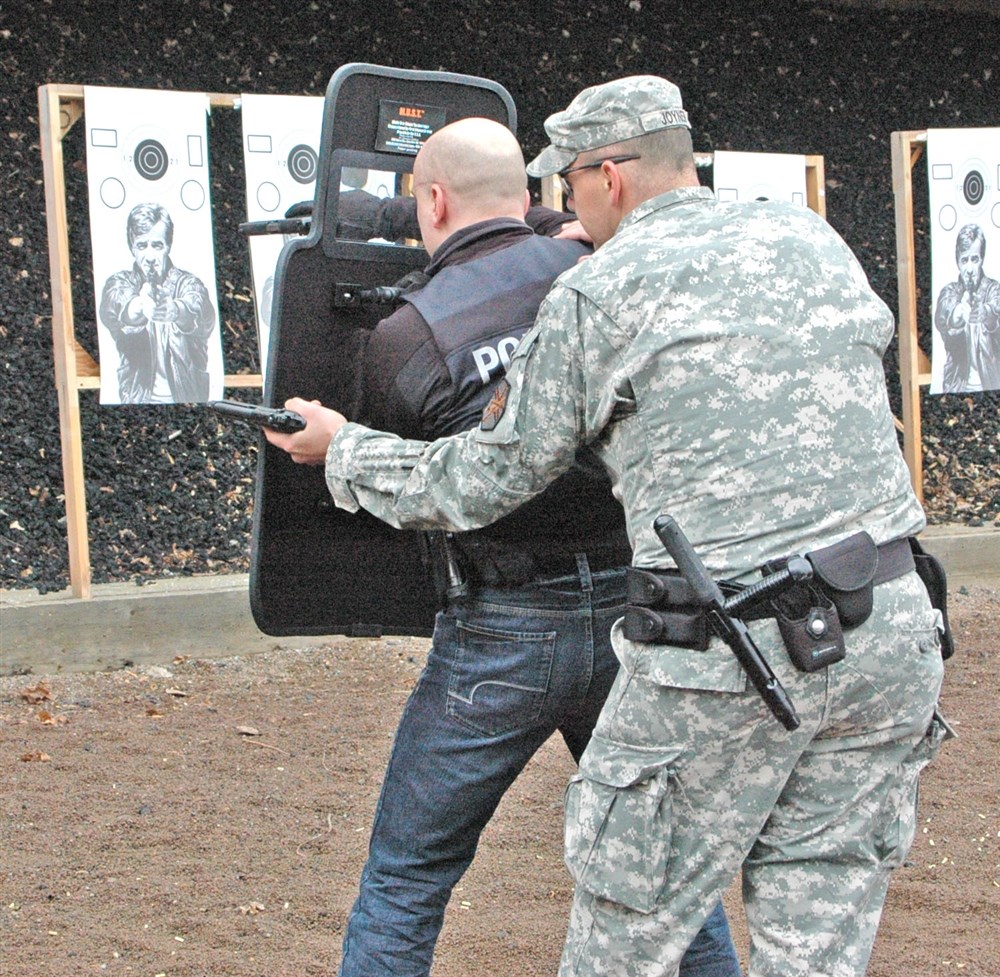 Army Sgt. Daniel Joyner of the U.S. Army Garrison Wiesbaden Directorate of Emergency Services backs up German Polizeihauptkommissar during Partnership Law-Enforcement Training. WIESBADEN, Germany 2010 © EUCOM/U.S. Army Europe/Anemone Rueger.
